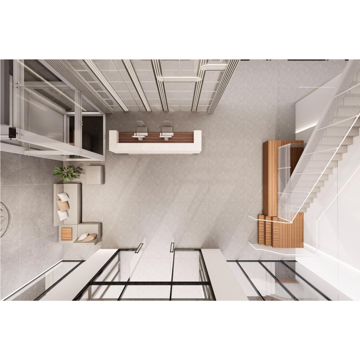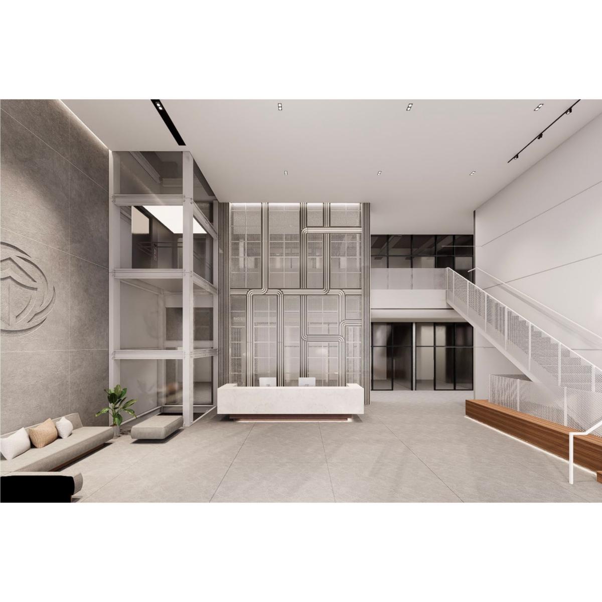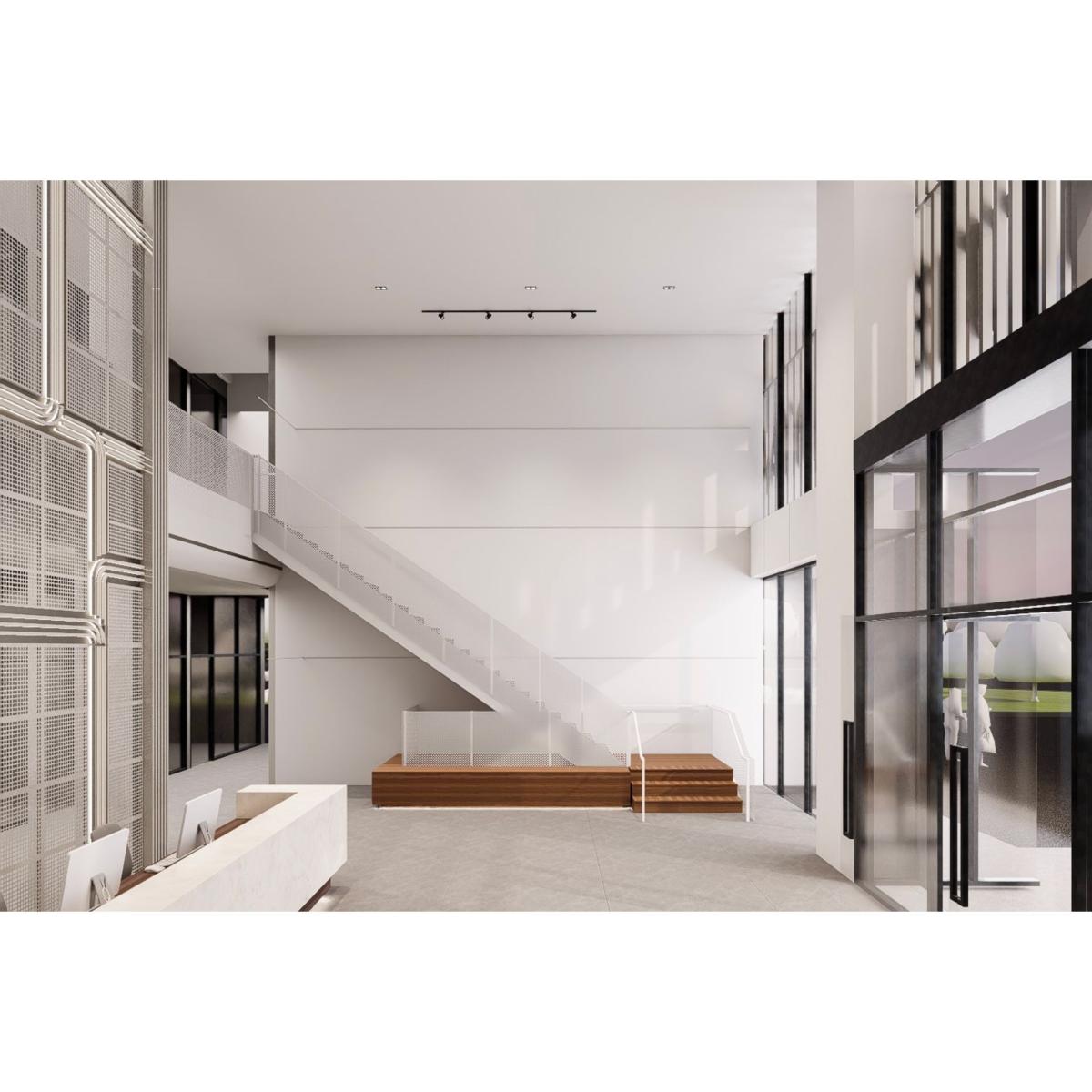 挑高大廳以石紋材質與金屬格柵為主,搭配柔和燈光,營造沉穩與科技兼具的氛圍。中央樓梯與通透夾層使空間視覺延伸,象徵開放與協作精神,體現Unionchem「安全、精準、現代化」的營運理念。