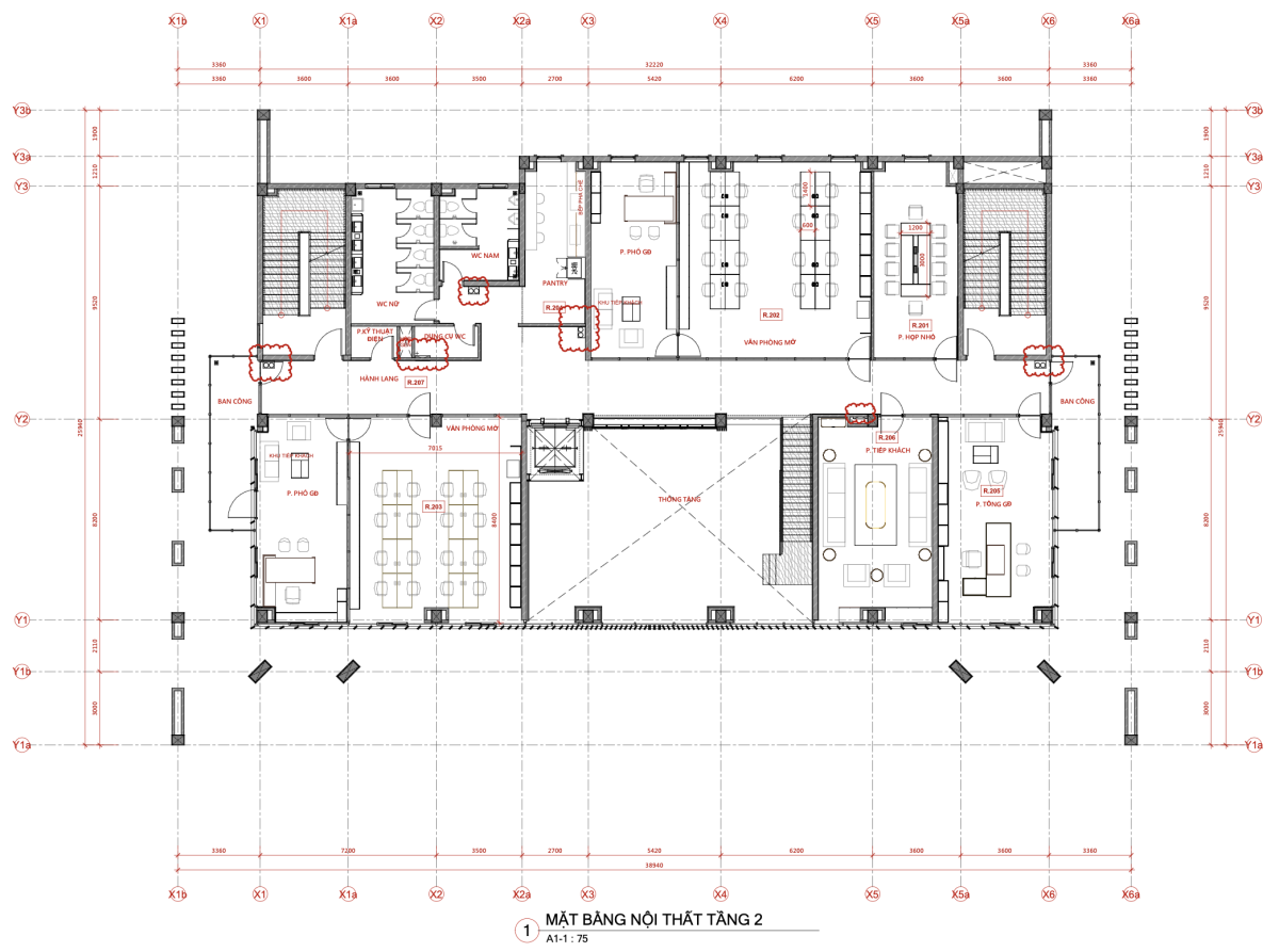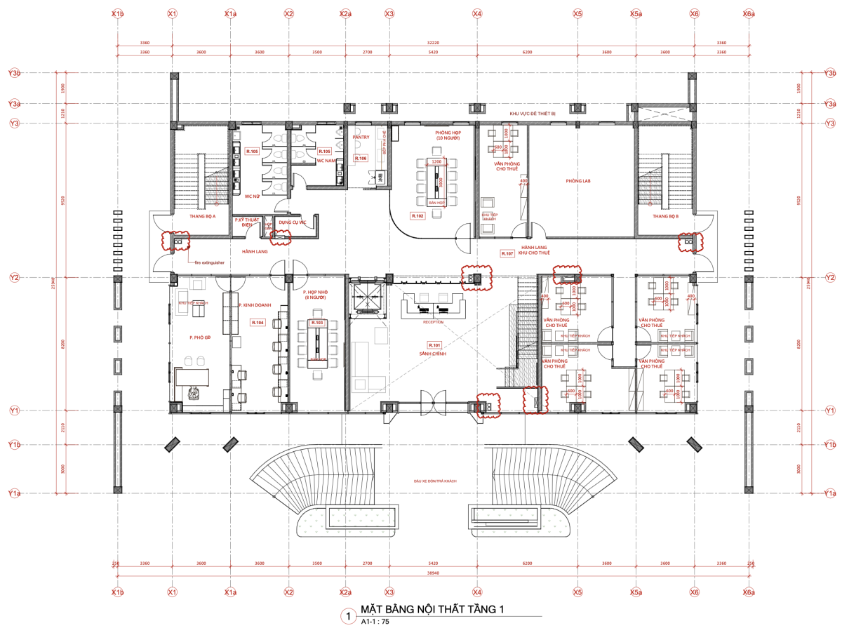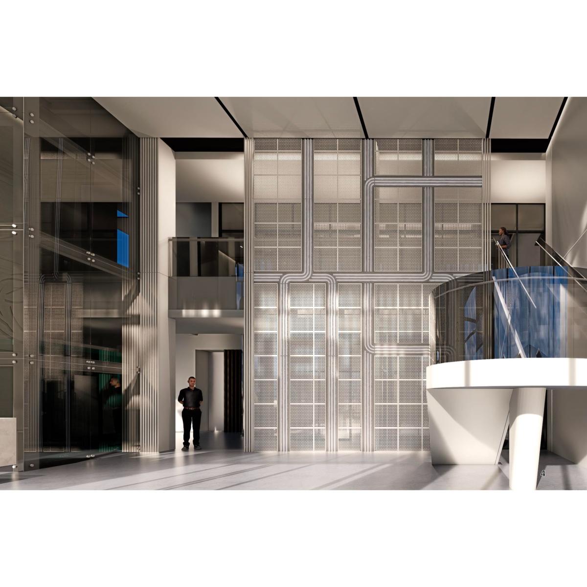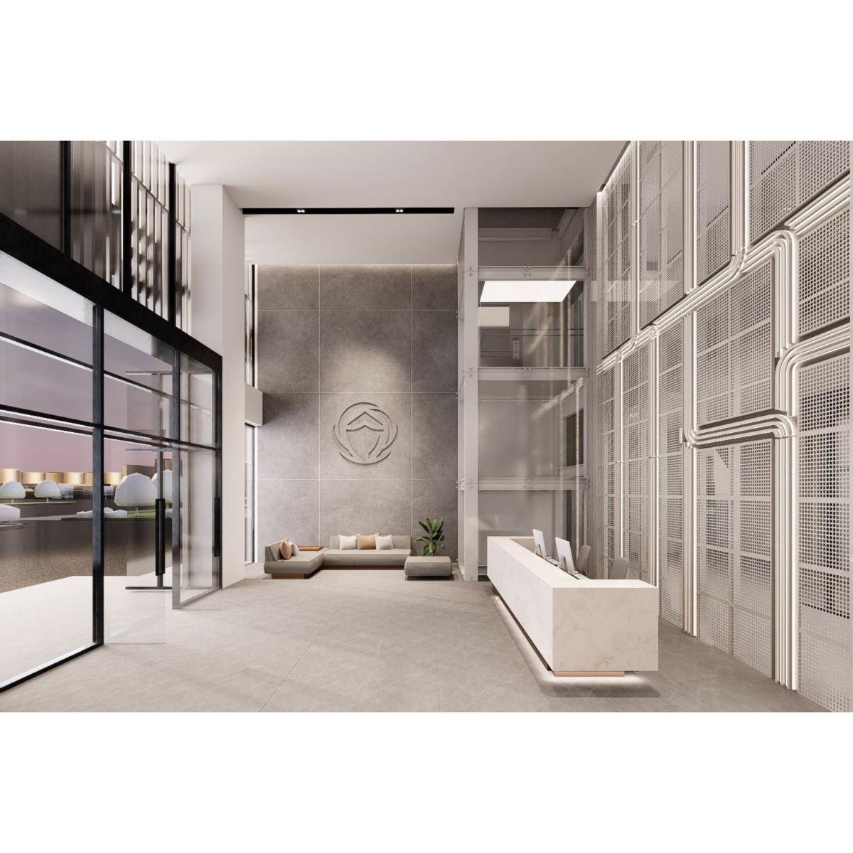 挑高大廳以石紋材質與金屬格柵為主,搭配柔和燈光,營造沉穩與科技兼具的氛圍。中央樓梯與通透夾層使空間視覺延伸,象徵開放與協作精神,體現Unionchem「安全、精準、現代化」的營運理念。