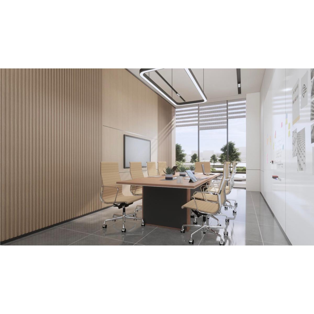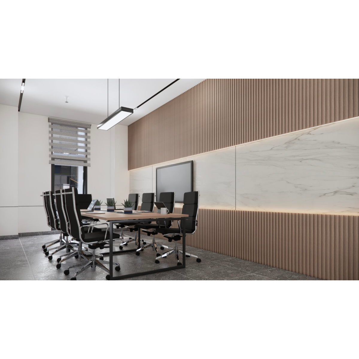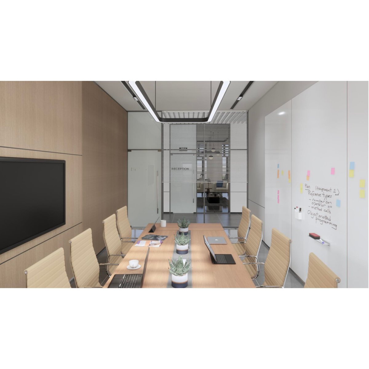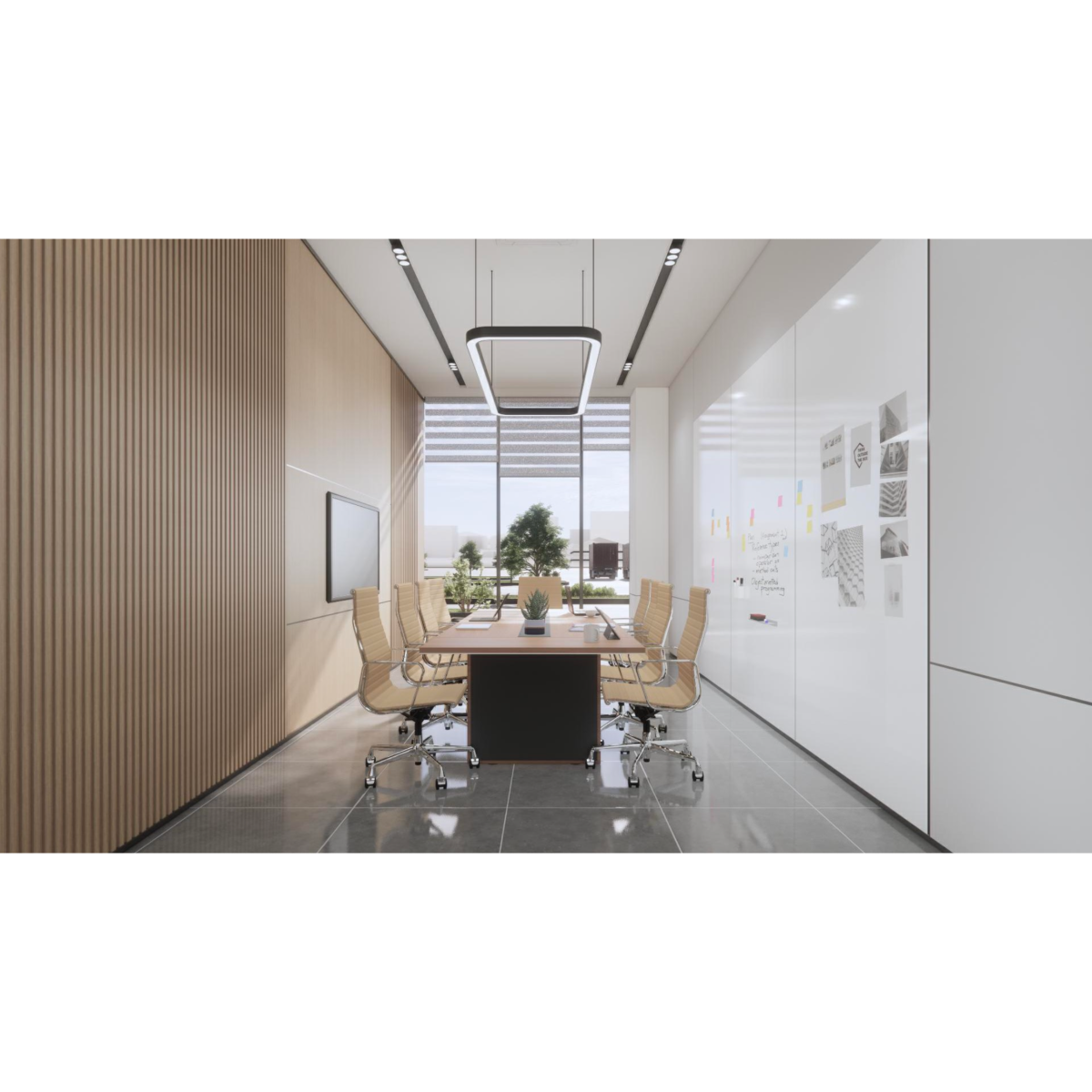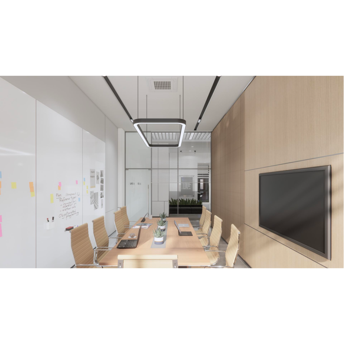 會議室以木質與大理石紋牆面結合間接燈光設計,營造沉穩、專注的會議氛圍。玻璃隔間使自然光線充分流通,讓部門之間保持開放透明的互動。