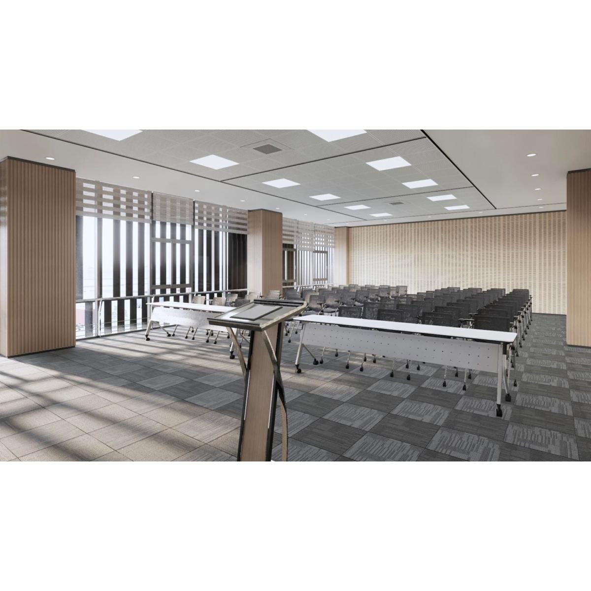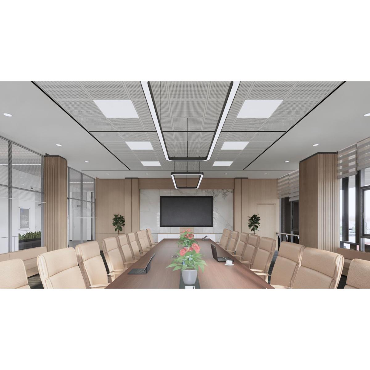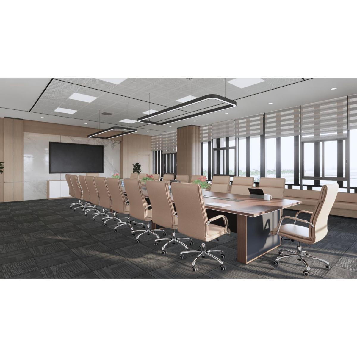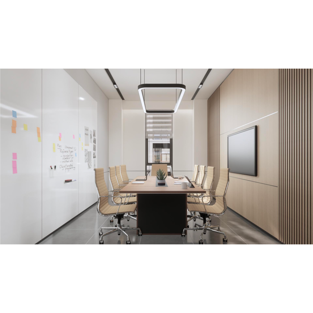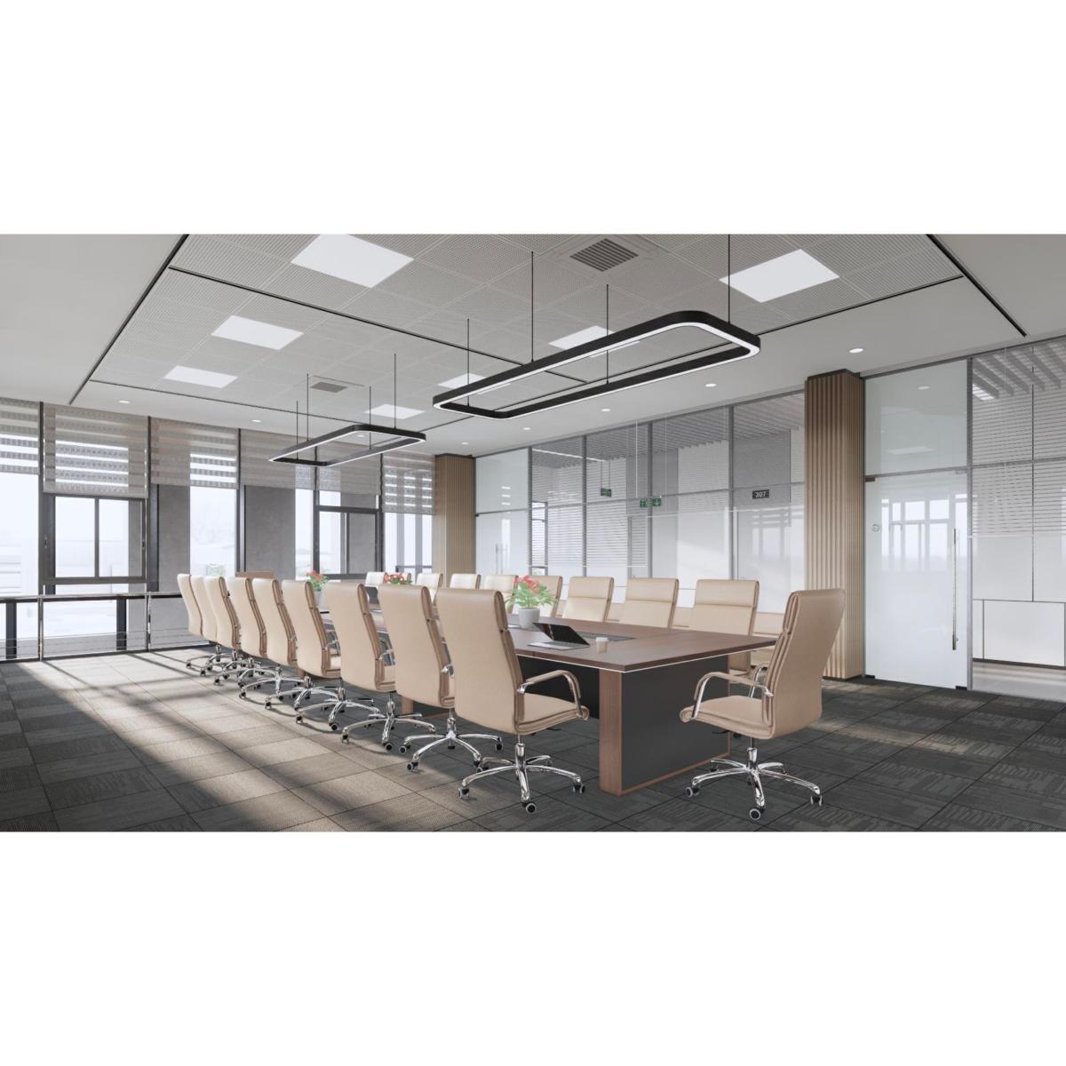 會議室以木質與大理石紋牆面結合間接燈光設計,營造沉穩、專注的會議氛圍。玻璃隔間使自然光線充分流通,讓部門之間保持開放透明的互動。