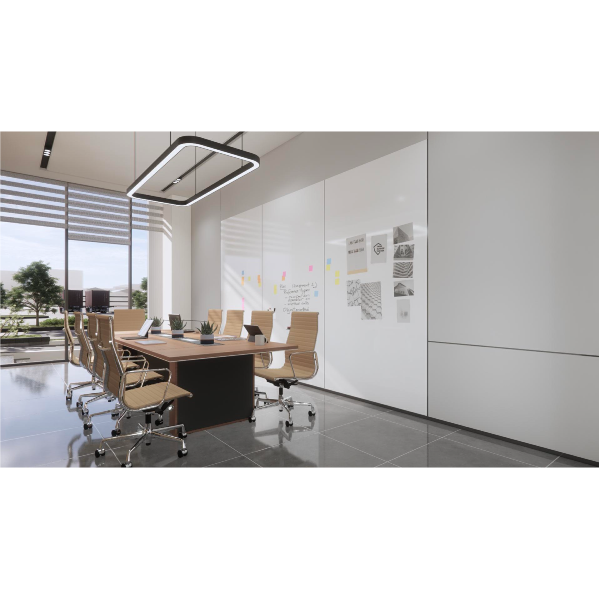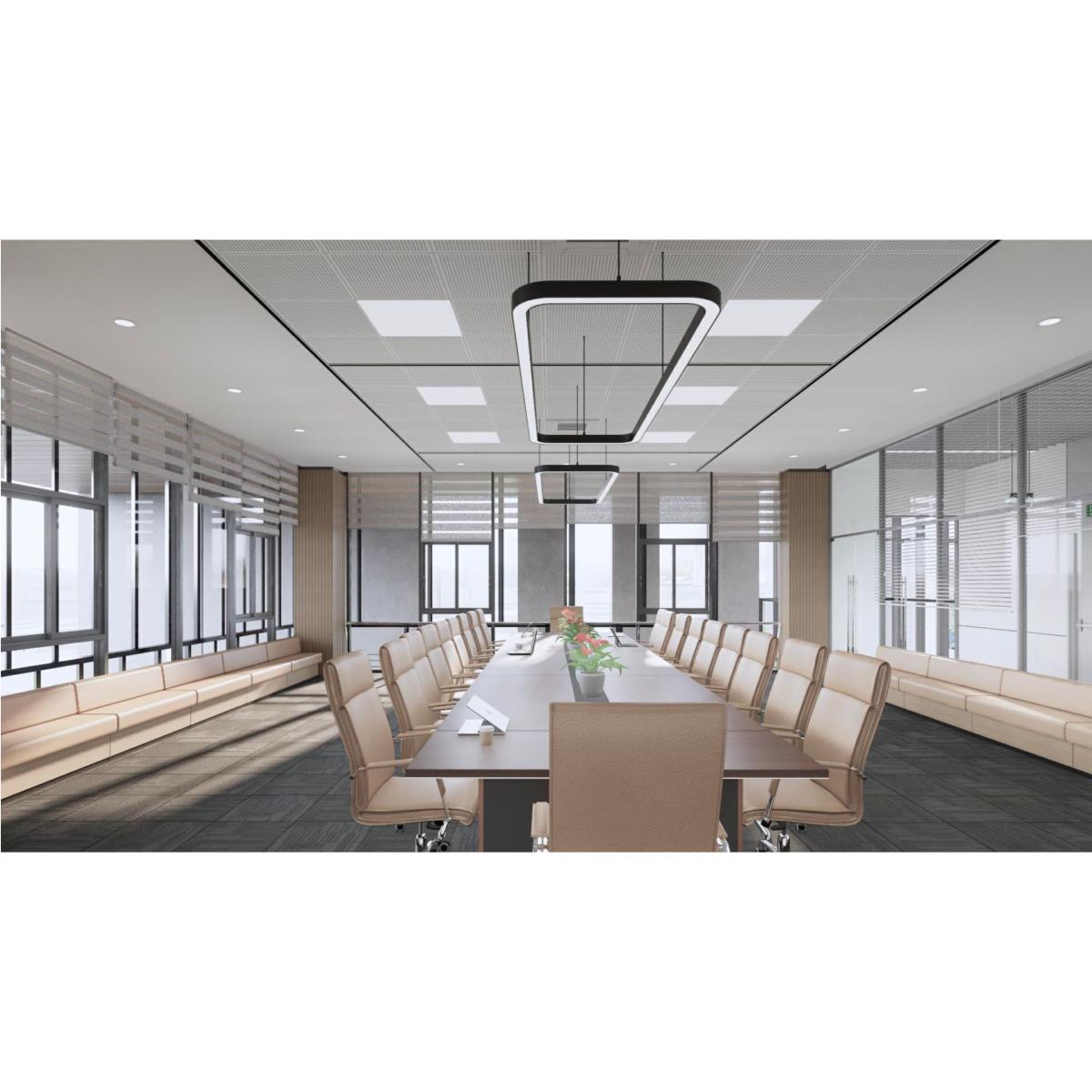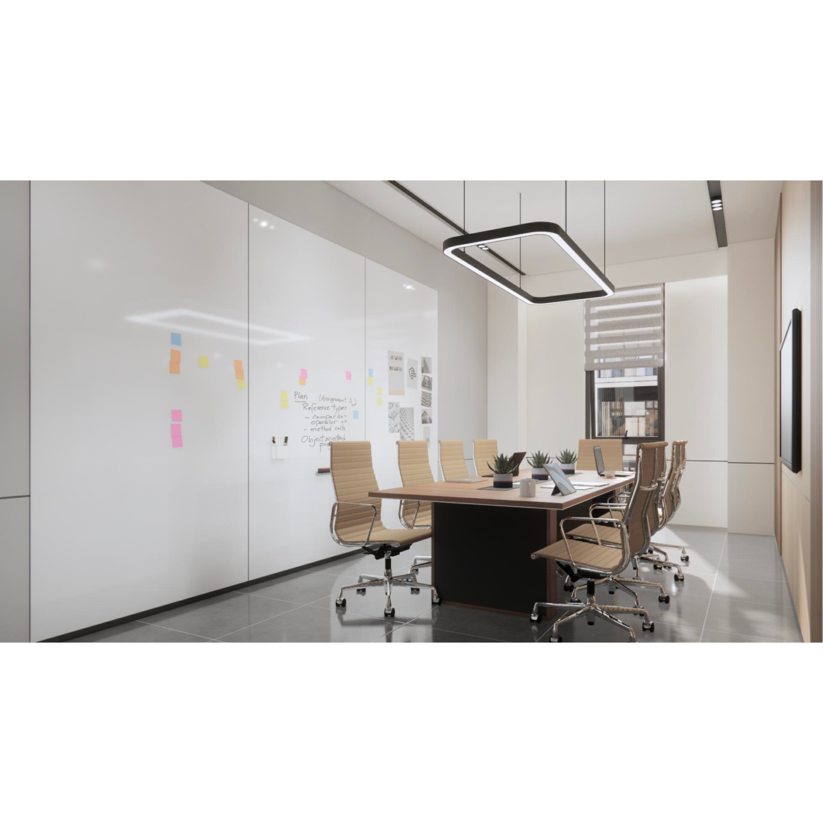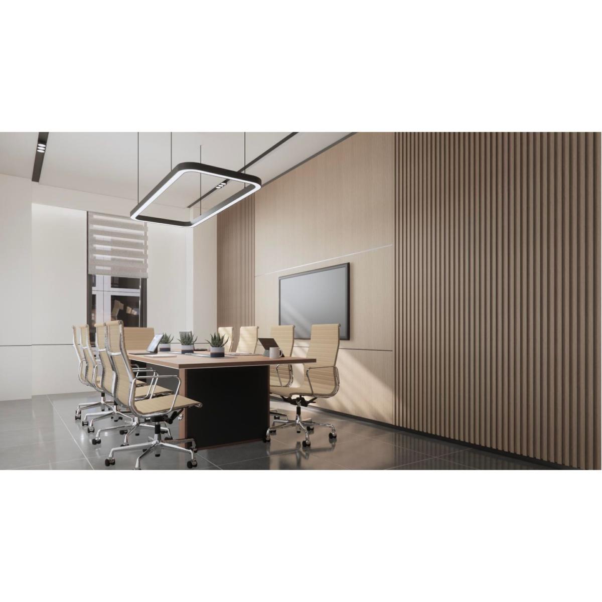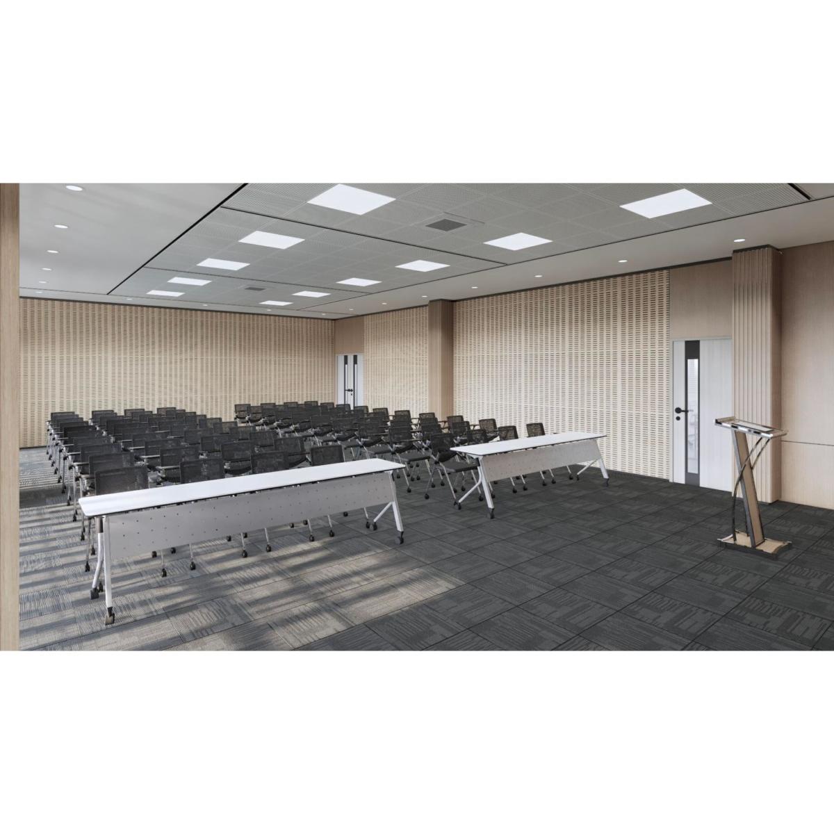 會議室以木質與大理石紋牆面結合間接燈光設計,營造沉穩、專注的會議氛圍。玻璃隔間使自然光線充分流通,讓部門之間保持開放透明的互動。