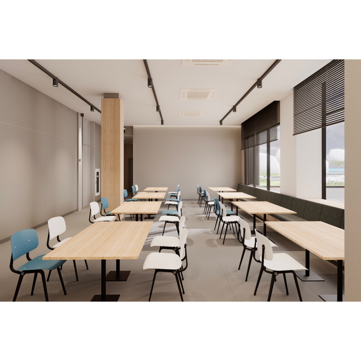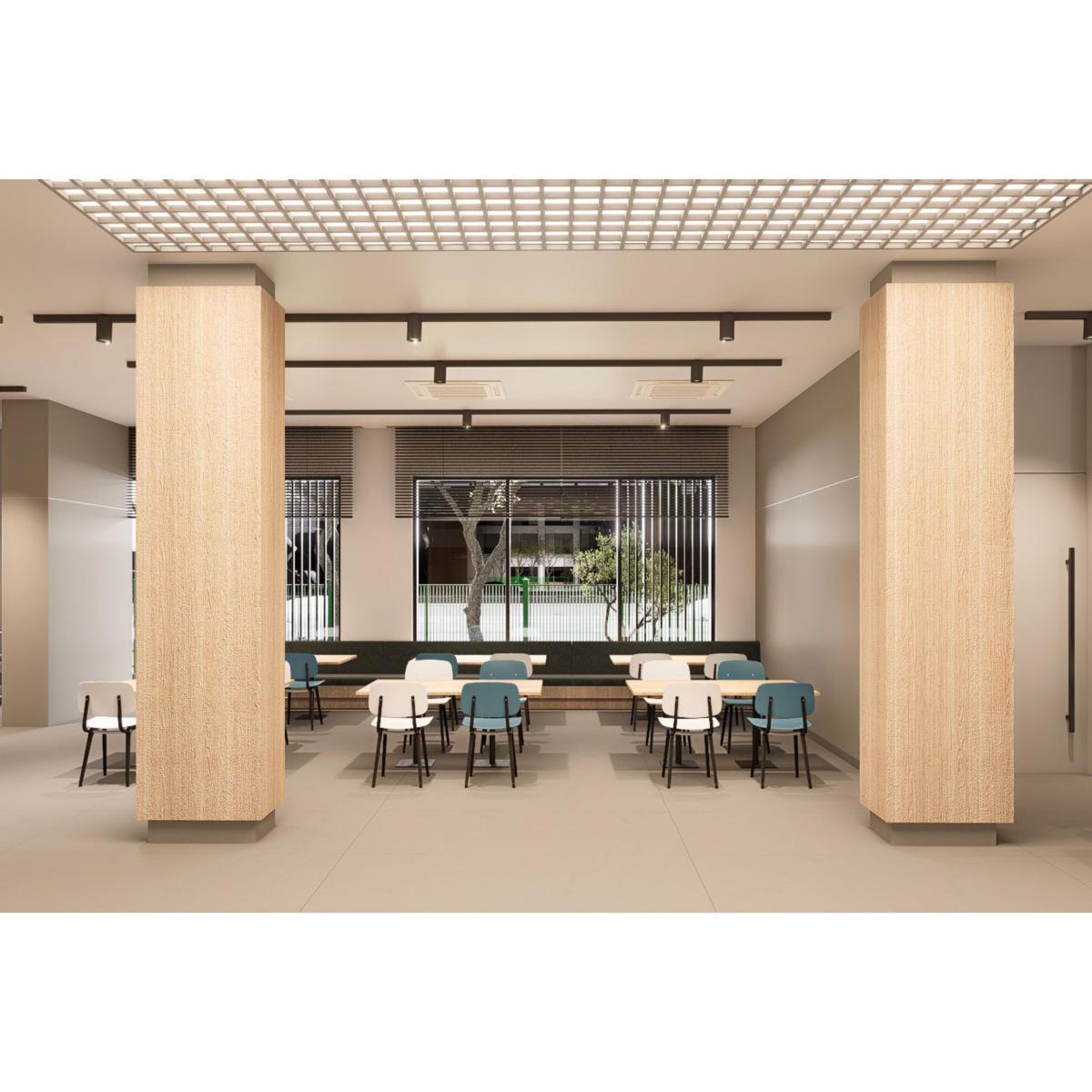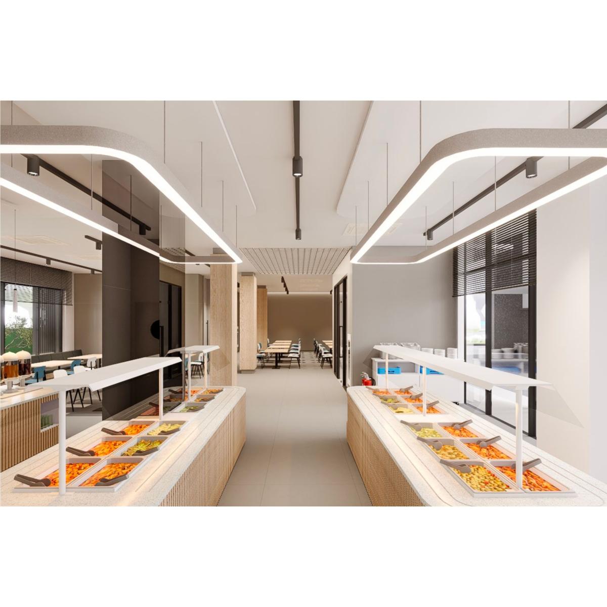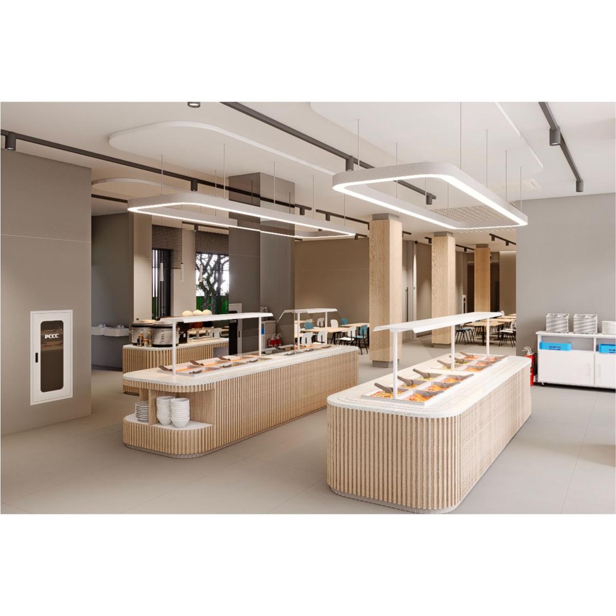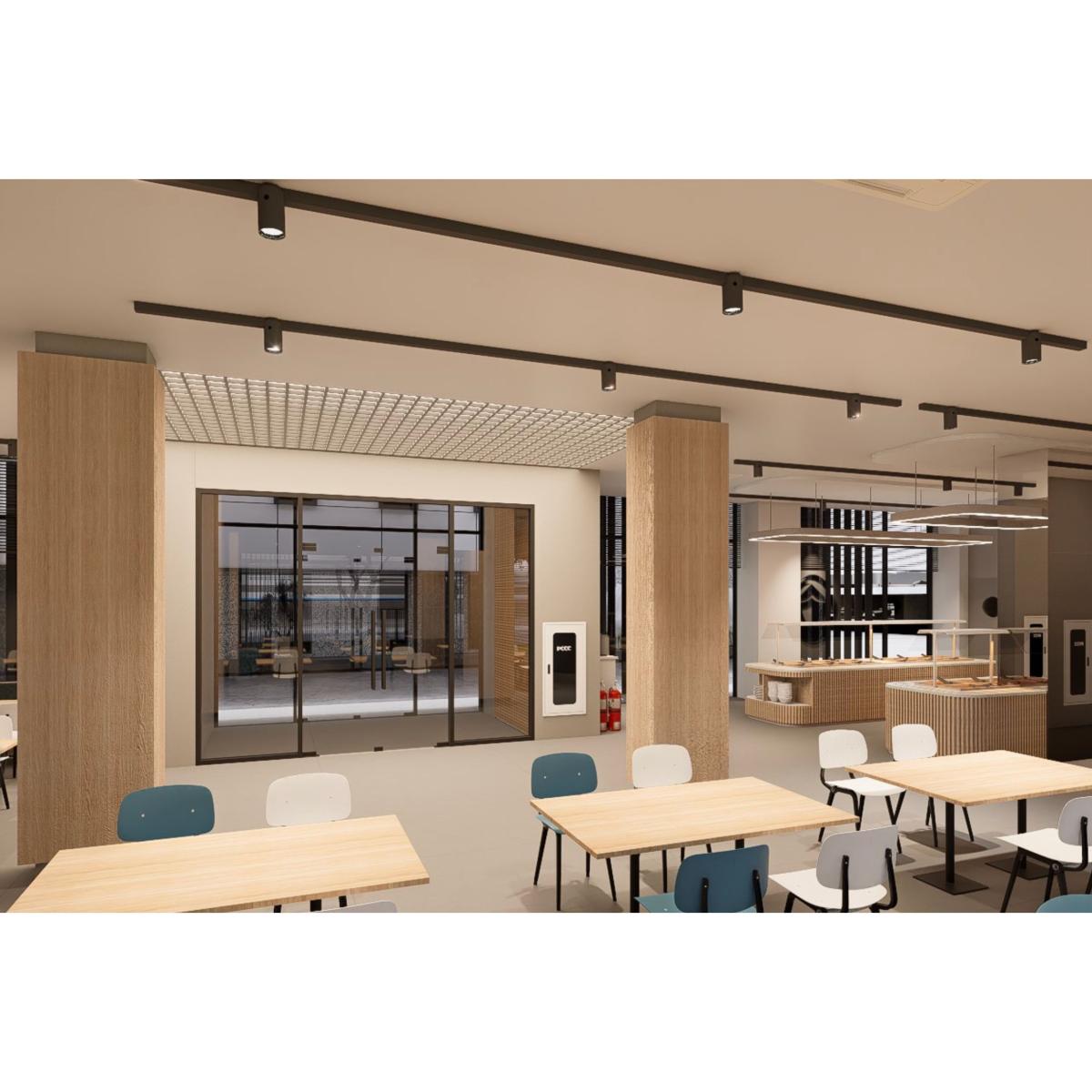 一樓設有 寬敞明亮的員工餐廳,以自然木質色系為主,大片玻璃窗引入戶外綠意。長桌式用餐設計與柔和燈光營造出開放、愉悅的氛圍,讓員工在舒適環境中交流與用餐。