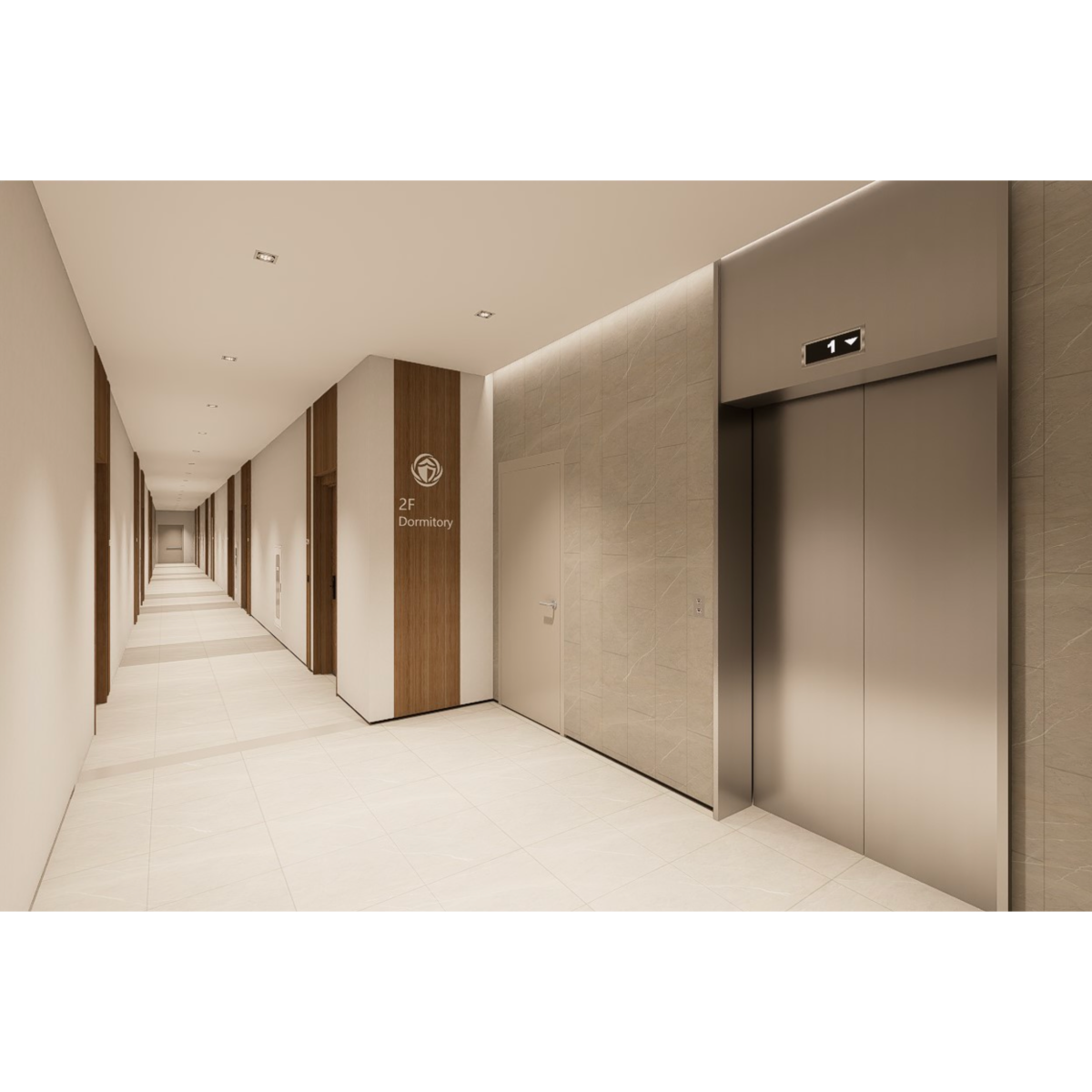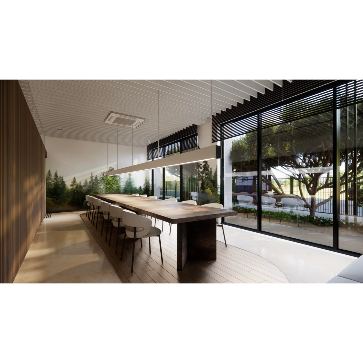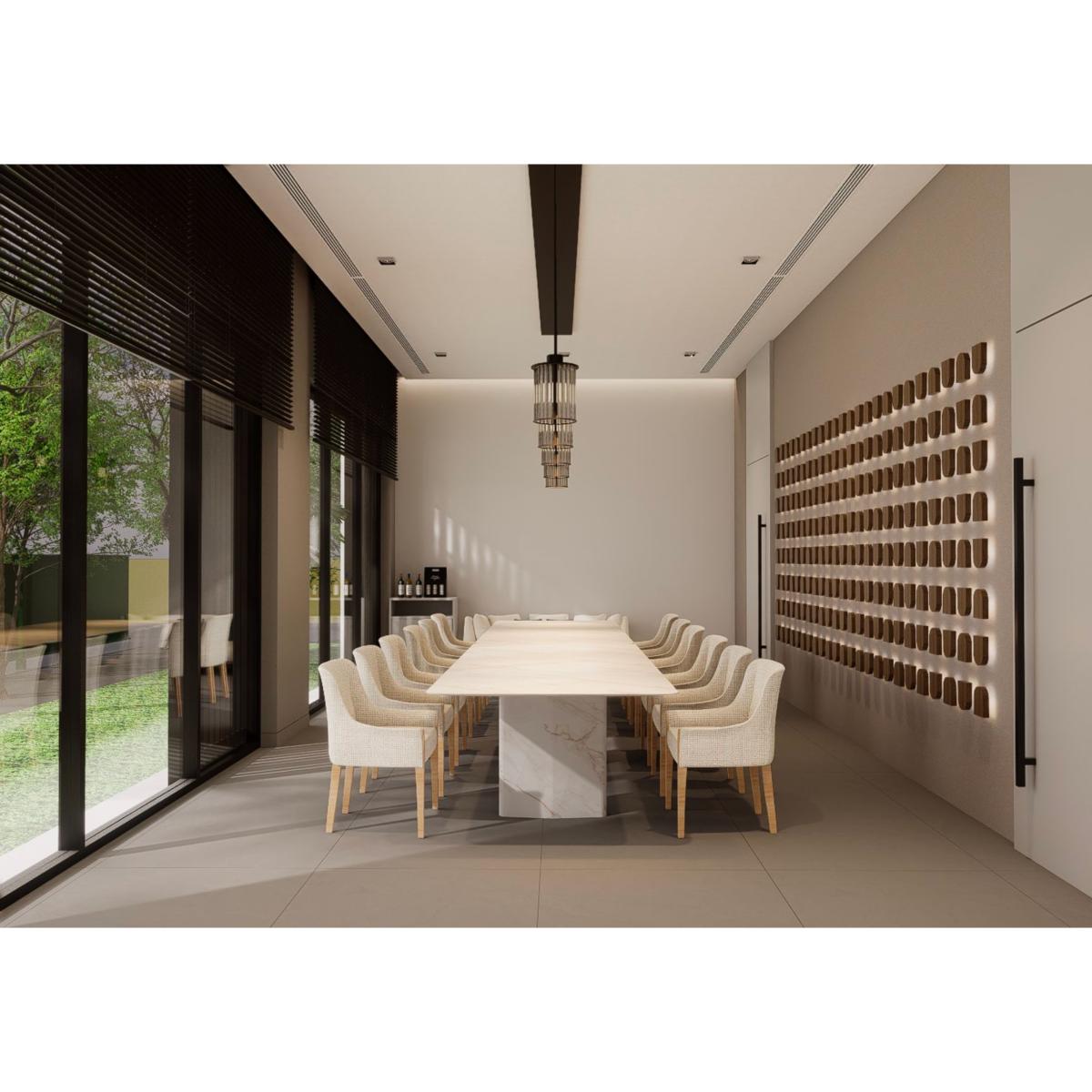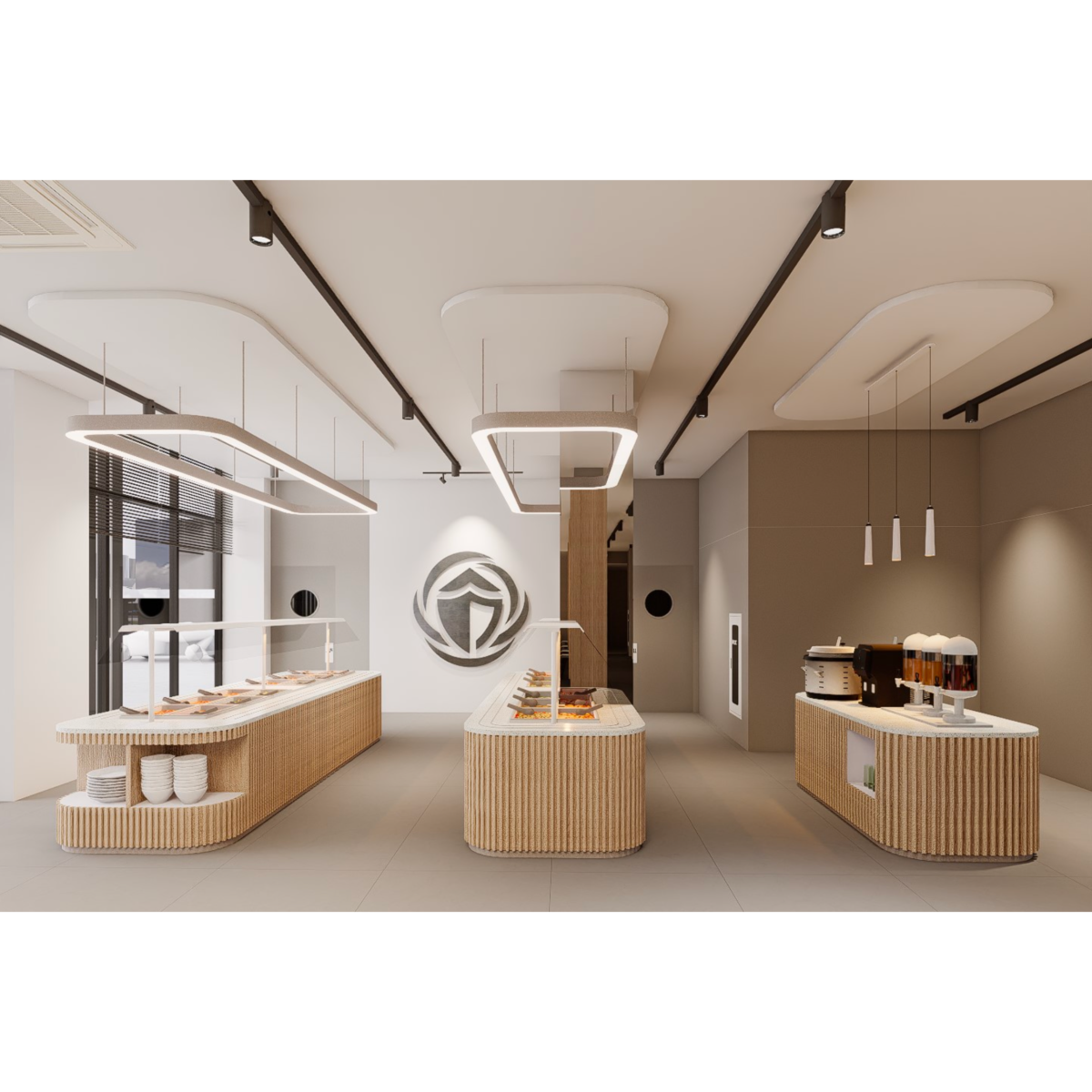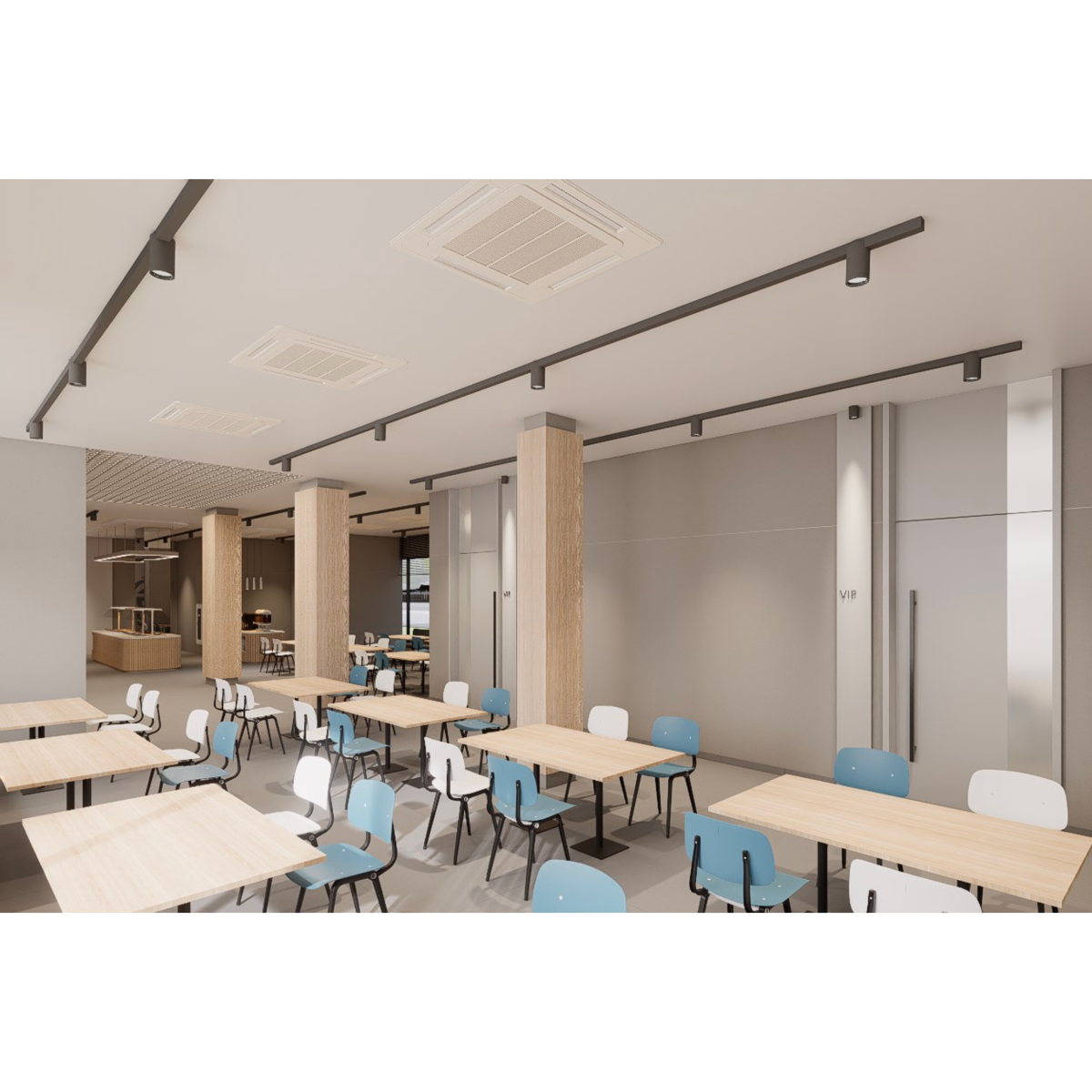 一樓設有 寬敞明亮的員工餐廳,以自然木質色系為主,大片玻璃窗引入戶外綠意。長桌式用餐設計與柔和燈光營造出開放、愉悅的氛圍,讓員工在舒適環境中交流與用餐。