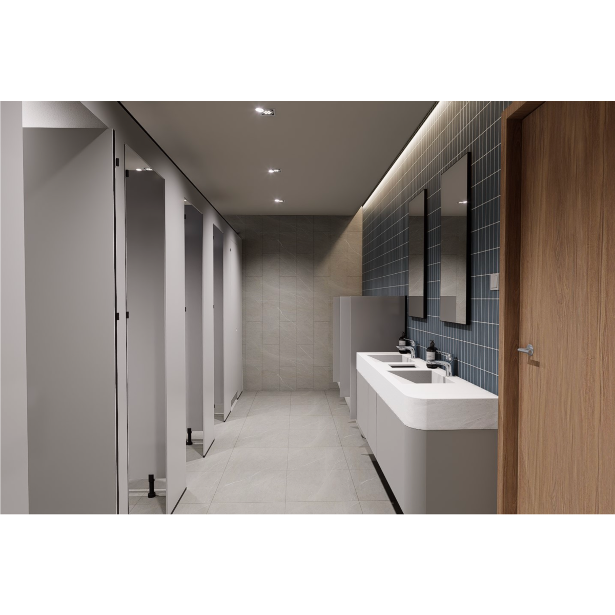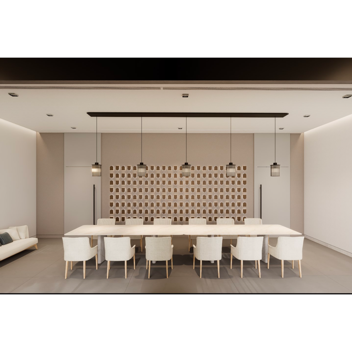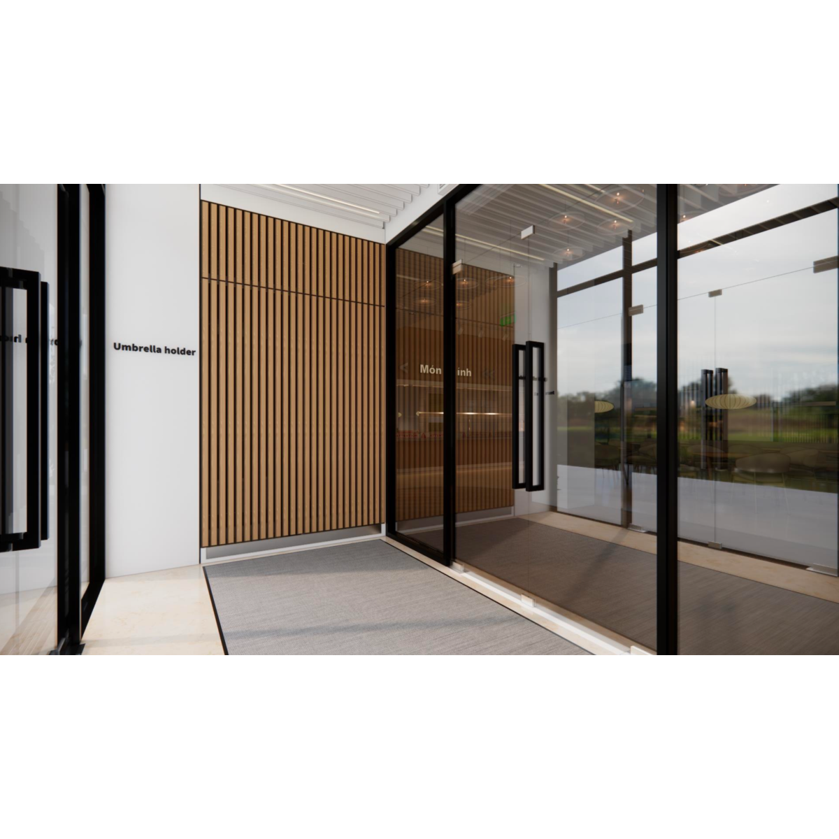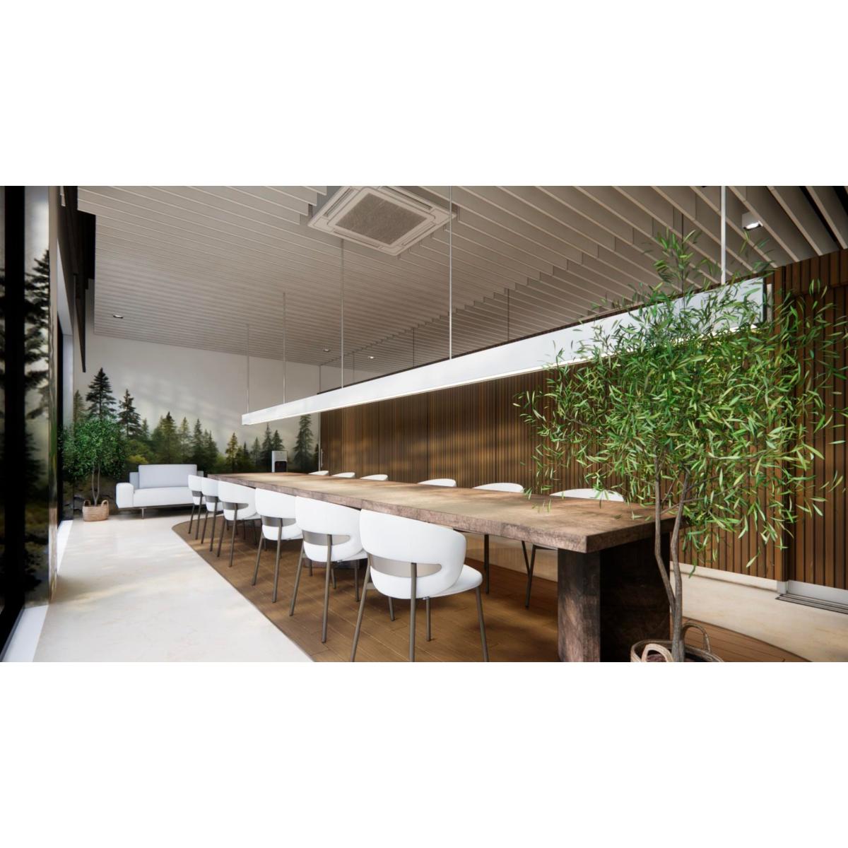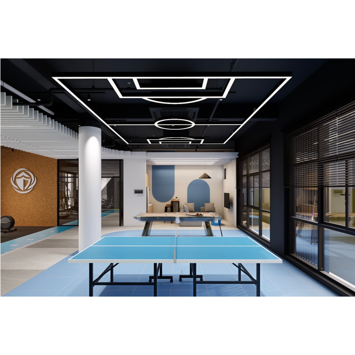 一樓設有 寬敞明亮的員工餐廳,以自然木質色系為主,大片玻璃窗引入戶外綠意。長桌式用餐設計與柔和燈光營造出開放、愉悅的氛圍,讓員工在舒適環境中交流與用餐。