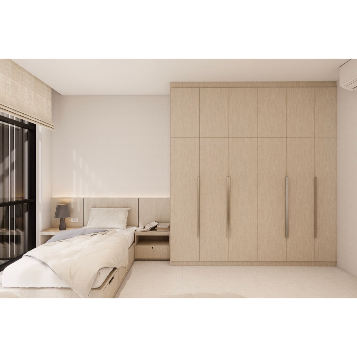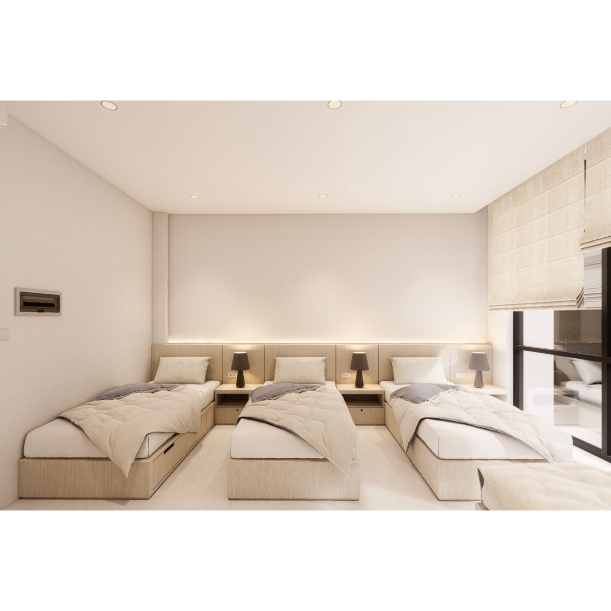 提供四人房等不同配置。每間房配有床鋪、衣櫃、書桌與冷氣設備,設計簡約清爽,注重實用與舒適。