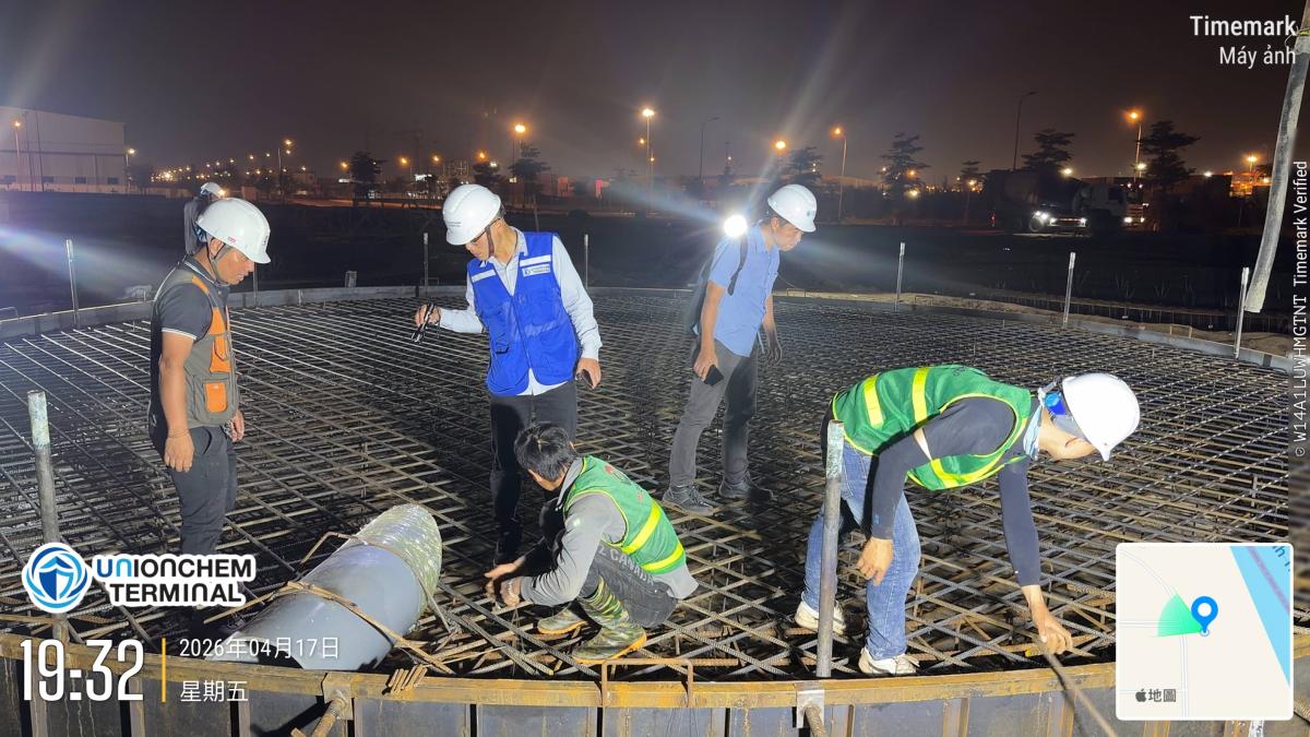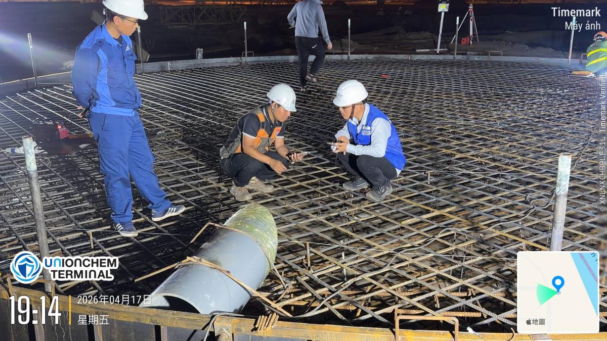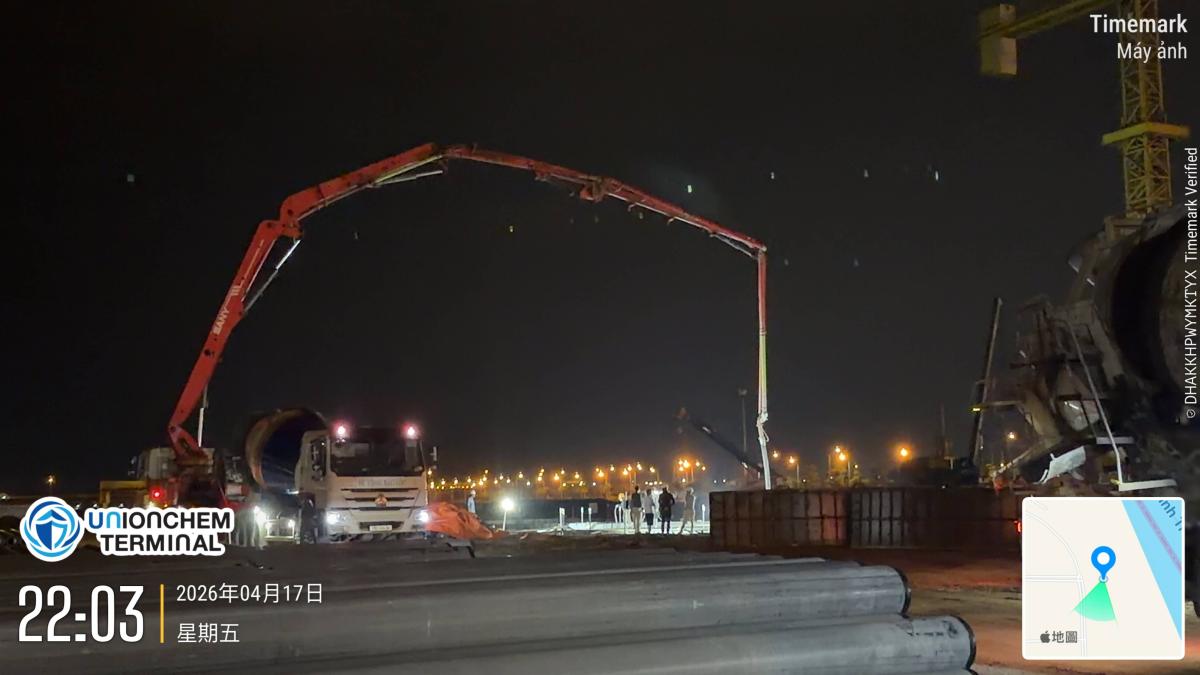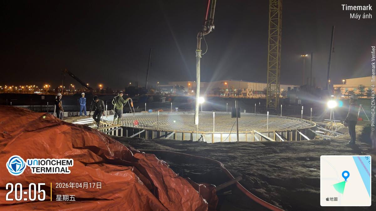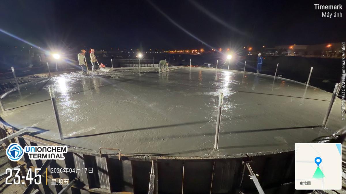 槽區建設更新 第一座儲槽基礎水泥澆灌 2026.04.17 頁面瀏覽: 3 對儲槽基礎鋼筋捆紮執行最後巡檢後,進行第一座儲槽基礎進行水泥澆灌,澆灌完成後,對水泥表面進行壓平打毛及養護。 上一則 2026.04.18 碼頭試樁及打樁持續更新 下一則 2026.04.15 進行儲槽基礎鋼筋捆紮